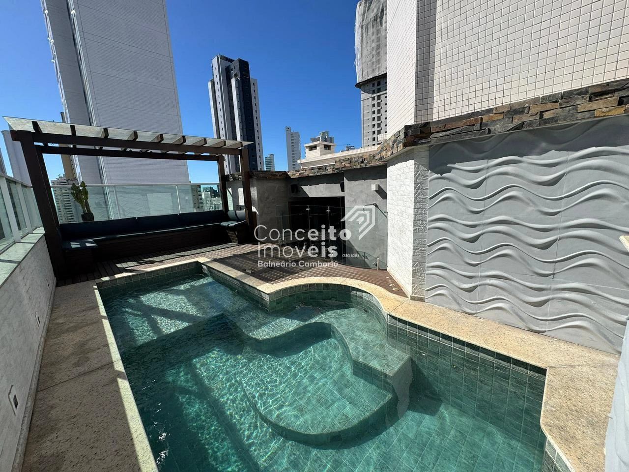 Mobiliada, decorada e equipada, esta cobertura de 240m² de área privativa com 04 suítes, 02 lavabos social, living integrado com sala de estar, sala de jantar e cozinha, churrasqueira à carvão, área de serviço, 04 vagas de garagem e uma piscina privativa com deck em um terraço aberto, com vista panorâmica da cidade.