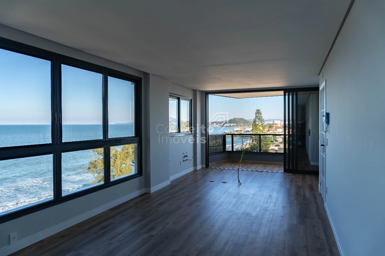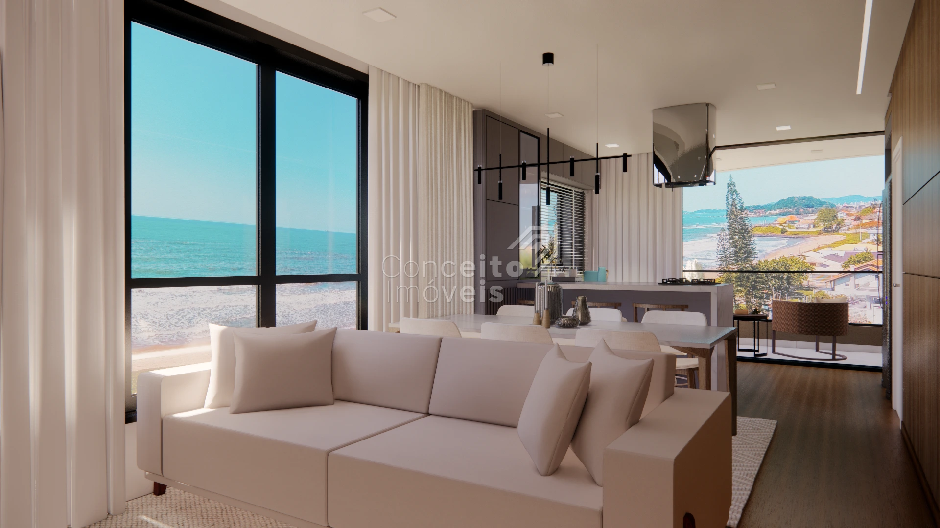 O living é amplo, iluminado por panos de vidro que oferecem vista panorâmica para o mar, e integrado à cozinha e varanda: