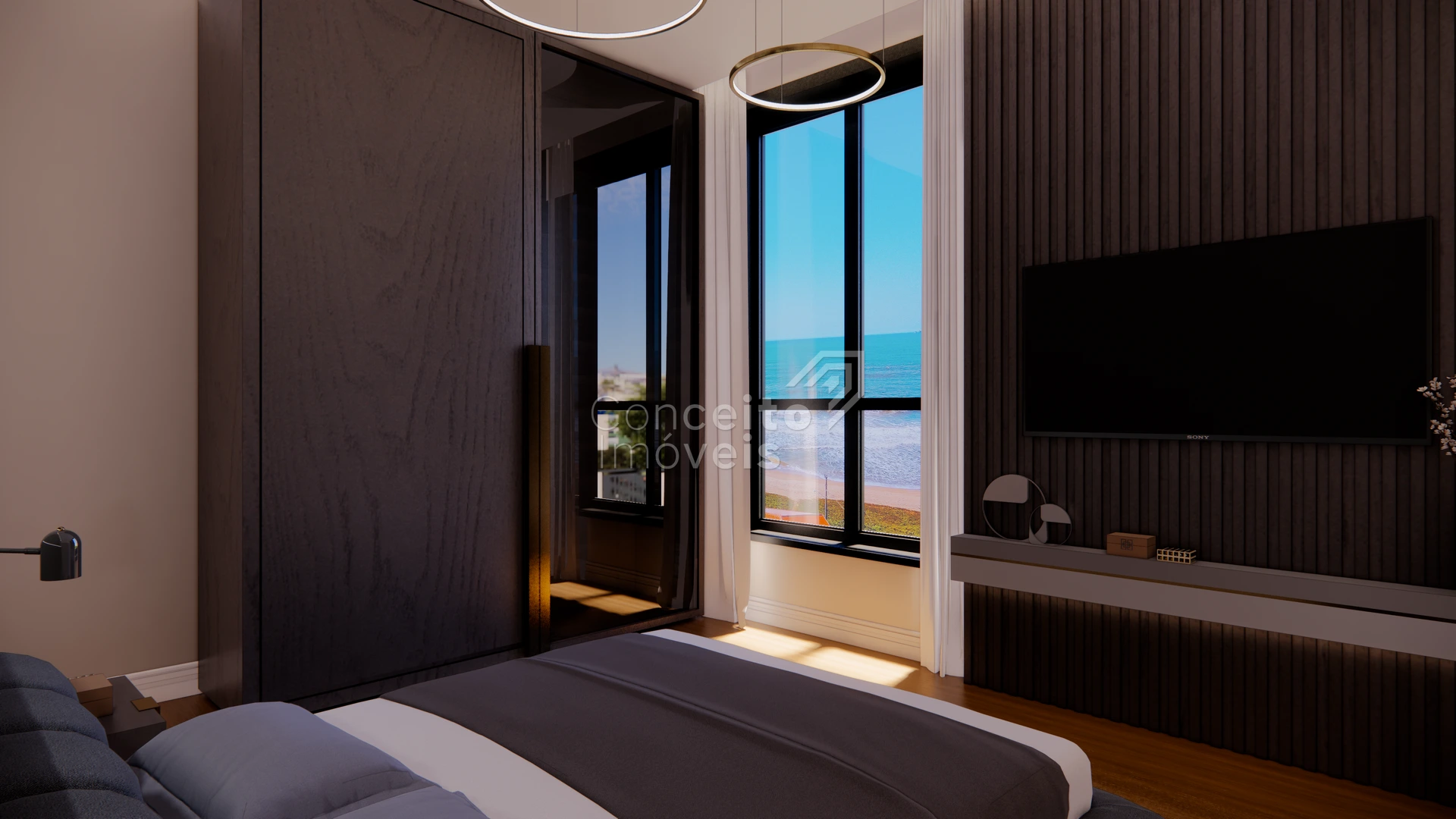 Ampla metragem para cama king-size e área de convivência