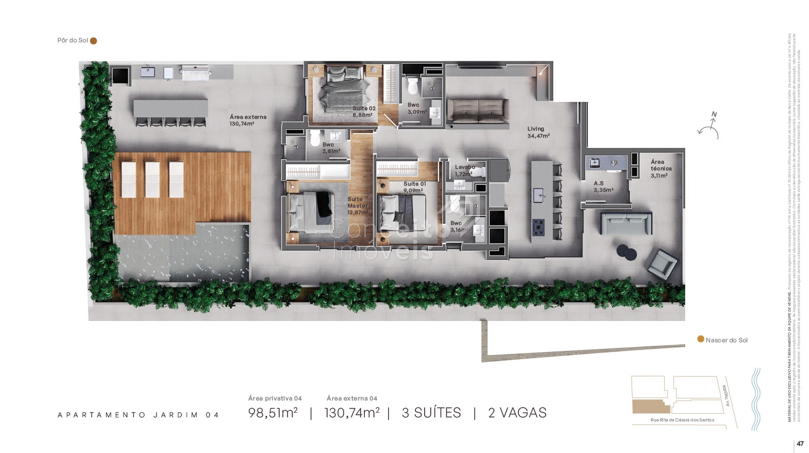 Metragens variam entre ~98 m² e ~159 m², com alternativas maiores nas unidades jardim.